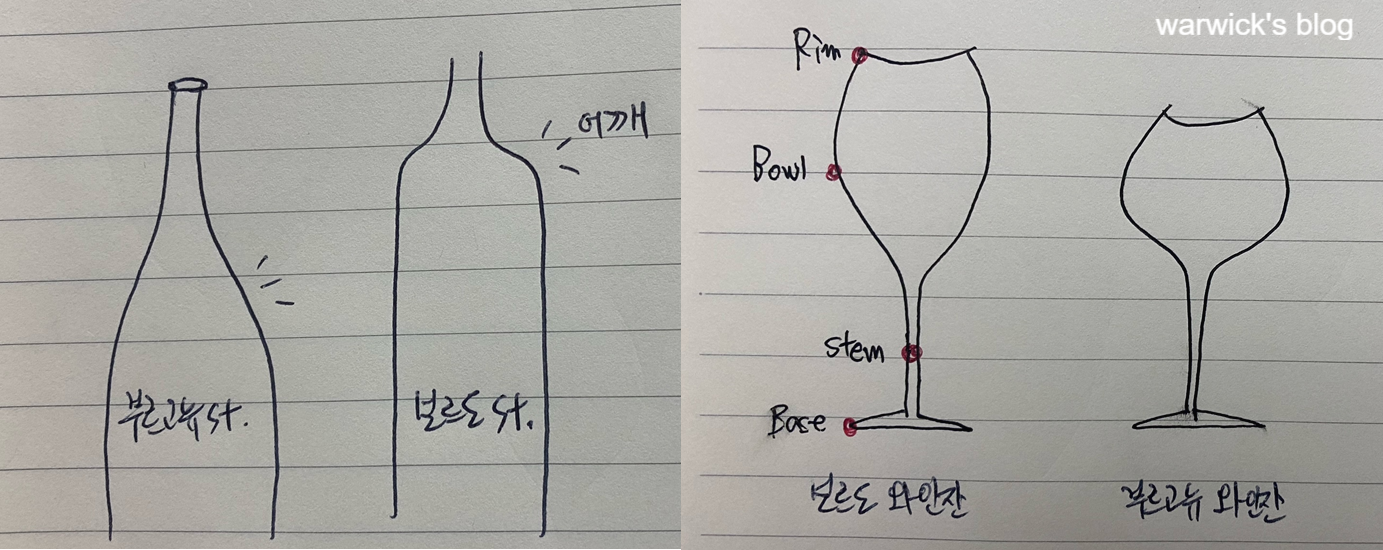 와인 애호가라면 와인 병모양이 나라별 산지별 제각각인 것을 알 것이다. 근데 왜 다른거냐고? 다 이유가 있다. 와인병 모양은 아주 크게 '보르도 타입'과 '부르고뉴 타입'으로 나뉜다. 보르도 타입의 와인병을 보면 각진 어깨가 항상 특징이다. 타닌이 많이 함유된 숙성형이라 앙금이 많이 생기는데, 와인을 따를 때 글라스에 이 앙금이 많이 들어가지 않게 하려면 어깨선에 찌꺼기가 쌓이도록 각진 모양이어야 효율적임.